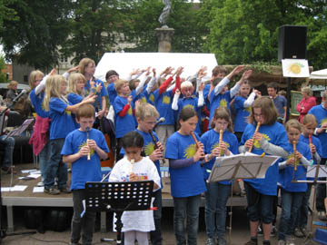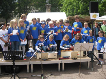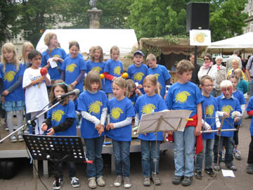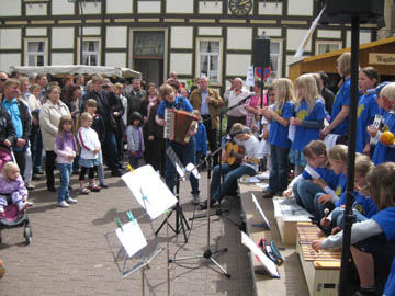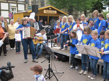 Angesagt waren Regenschauer und Gewitter, aber als die Kinder der Grundschule Bornum die kleine Bühne auf dem Buchholzmarkt erklommen, strahlte die Sonne mit unserem neuen Logo um die Wette. Nicht nur Eltern waren gekommen, um unseren Beitrag zum Hansetag 2011 zu hören. Begonnen haben wir natürlich mit unserem Schullied, damit jeder gleich weiß, wer da auf der Bühne steht. Das Zirkuslied erinnerte noch mal an unsere schöne Projektwoche. Bei "Old Mac Donald had a farm" zeigten die Klassen 2a und 4 ihr Können auf der Blockflöte, gefolgt von dem Mundharmonikastück der Kinder aus den Klassen 2b und 3. Mit dem Lied "Tiritomba" riefen wir noch einmal den Frühling herbei, bevor zum Abschluss die Sonne auf ihre Reise ging.